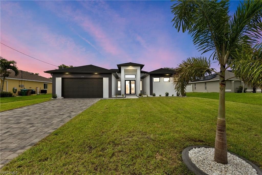Located in highly desirable SW Cape Coral, this stunning new construction home epitomizes luxury and comfort. Step through grand double doors into an open living space with soaring ceilings and a custom fireplace. The home features tile flooring throughout, ensuring both elegance and easy maintenance. Ideal as a primary residence, second home, or investment, this property offers a carefree lifestyle with no HOA. The gourmet kitchen features quartz countertops, a large waterfall island, and soft-close shaker cabinets. An oversized laundry room fitted with a new washer and dryer adds convenience. The primary suite is a luxurious retreat with a spa-like en-suite bath, double sinks, a walk-through shower with dual heads, a soaking tub, and custom cabinetry in spacious walk-in closets. The split floor plan ensures privacy, with two additional bedrooms and a bathroom that opens directly to the pool and lanai. Step outside to an expansive lanai, complete with an outdoor kitchen and picture screen. The saltwater pool invites you to relax and unwind, turning every day into a vacation. Impact doors and windows throughout the home provide added peace of mind. Situated close to beaches, shopping, dining, and medical facilities, this home is perfectly located. Whether for permanent residence, seasonal escape, or investment, it exceeds expectations. Schedule your private tour today!